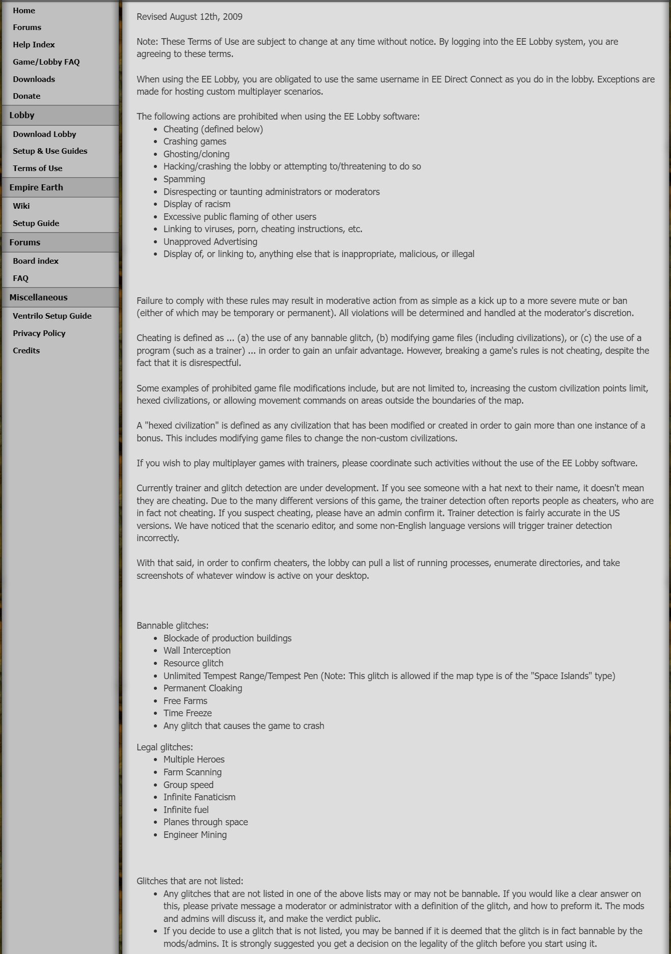 You must be talking about the old lobby ToS: This part of the forum was removed when NeoEE came out. This was made by the Save-EE team and don't apply to NeoEE.Neotje wrote: ↑Sat Jun 11, 2022 3:37 amYeah, group speed is typically accepted/unaccepted, and was never a bannable offence as far as I know. However we had a list with glitches that was not allowed at some point, for example blocking the unit production of buildings, glitching holes into a wall, and I guess some more of them. The guy I was playing with figured "well if it's not disallowed, it must be allowed". And I can't actually find a spot which... disallows it. Some glitches are also way more obvious glitches than others. Putting a shield on a unit is not a glitch, that's a feature (and disallowed as a game rule), the group speed is... probably a glitch, but defendable as a feature. Deleting walls is... probably a glitch.