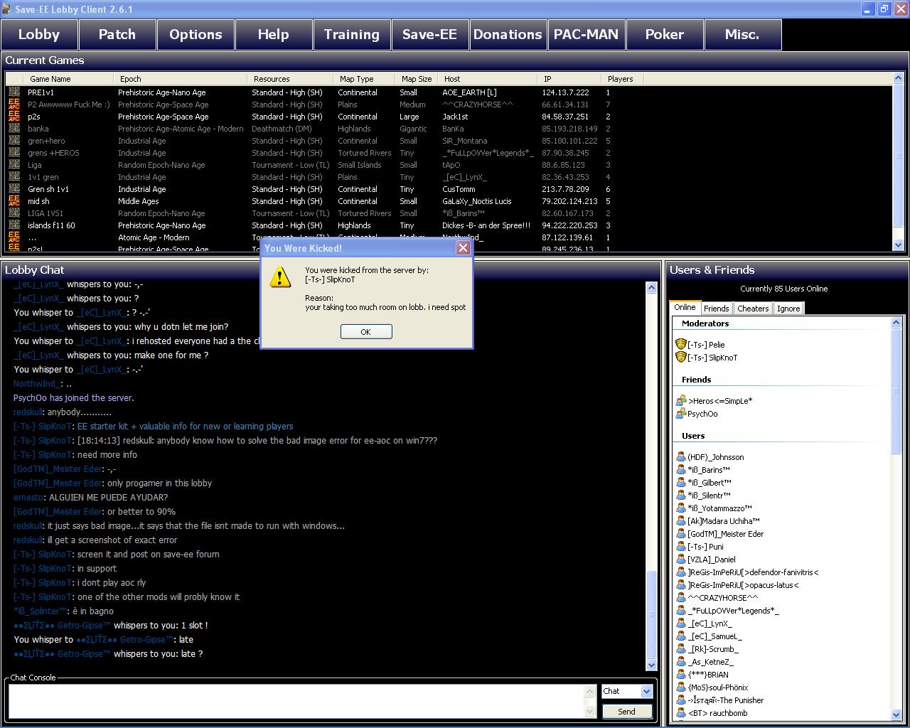 Is that how the Mods have their fun in the lobby , realy good job A* for that , you doing a realy serious job slipknot and it is fricking anyoing. And this is acutally realy not acceptable , pls look at the reason i got kicked , wtf ??! What is the job of a SAVE-EE moderator , for sure not kicken people for : '' SOme space in the lobby '' , thats the way slipknot , YES thats the way to save ee...