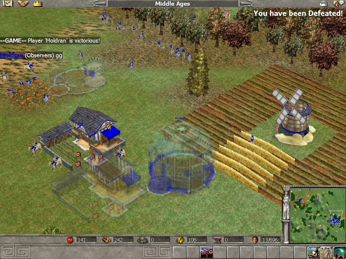 The other game is also a ladder one vs the organizer, Moldran, july 18th 2005. I lost this game, and was surprised by how good he was since he had some other wierd losses. I think at this stage I was very very weak in ages such as middle but allright in ww1 ->