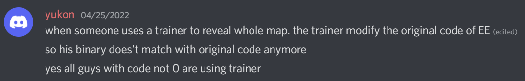 If yukon is indeed correct and all his data is accurate along with his claims of trainer users then I think now yukon or whoever takes charge from here must ban anyone who tries to modify their EE at any point before or during the game. Bans should be temporary followed by permanent ones if they don't learn. We don't want to play against trainer users at all. What yukon said to us is that he only bans people if they abuse the trainers, he for whatever reason does not simply ban anyone with the trainers as he deems it not a good reason which is laughable. So trainer usage must be simply eliminated. And those who have used it (the names that were hidden) should be revealed because 1. they deserve to be exposed 2. We need to know who they are as we may have been victims of their actions. I mean it was ok to reveal 2 names that directly impacted yukon in games but its not ok to reveal the rest? make it make sense.