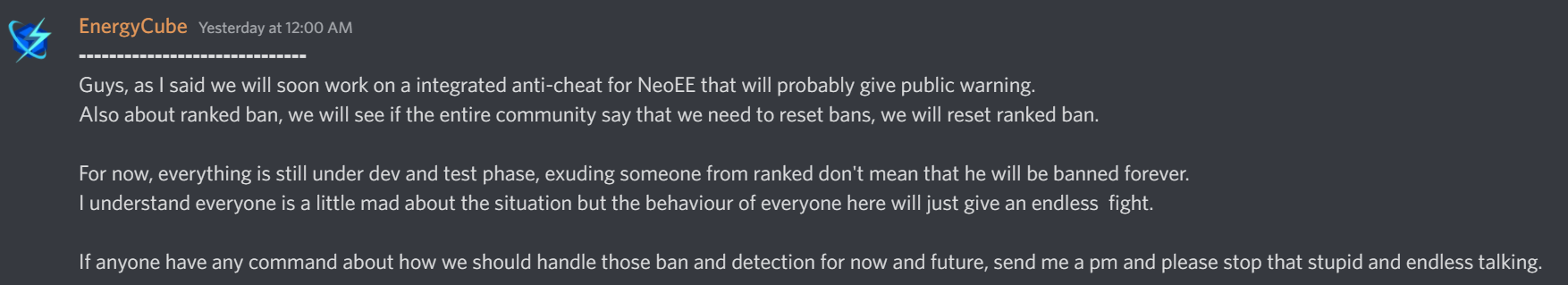 Shortly after Yukon did provide proof: EnergyCube got a technical explanation and said he agrees with Yukon's assessment that the player dVXB7E in fact did cheat. Now of course this opened a can of worms that is way bigger than just dVXB7E. As everyone who looked at the picture can see there are multiple players with 1 and 13. Out of the 34 players in that list 7 are using a trainer.