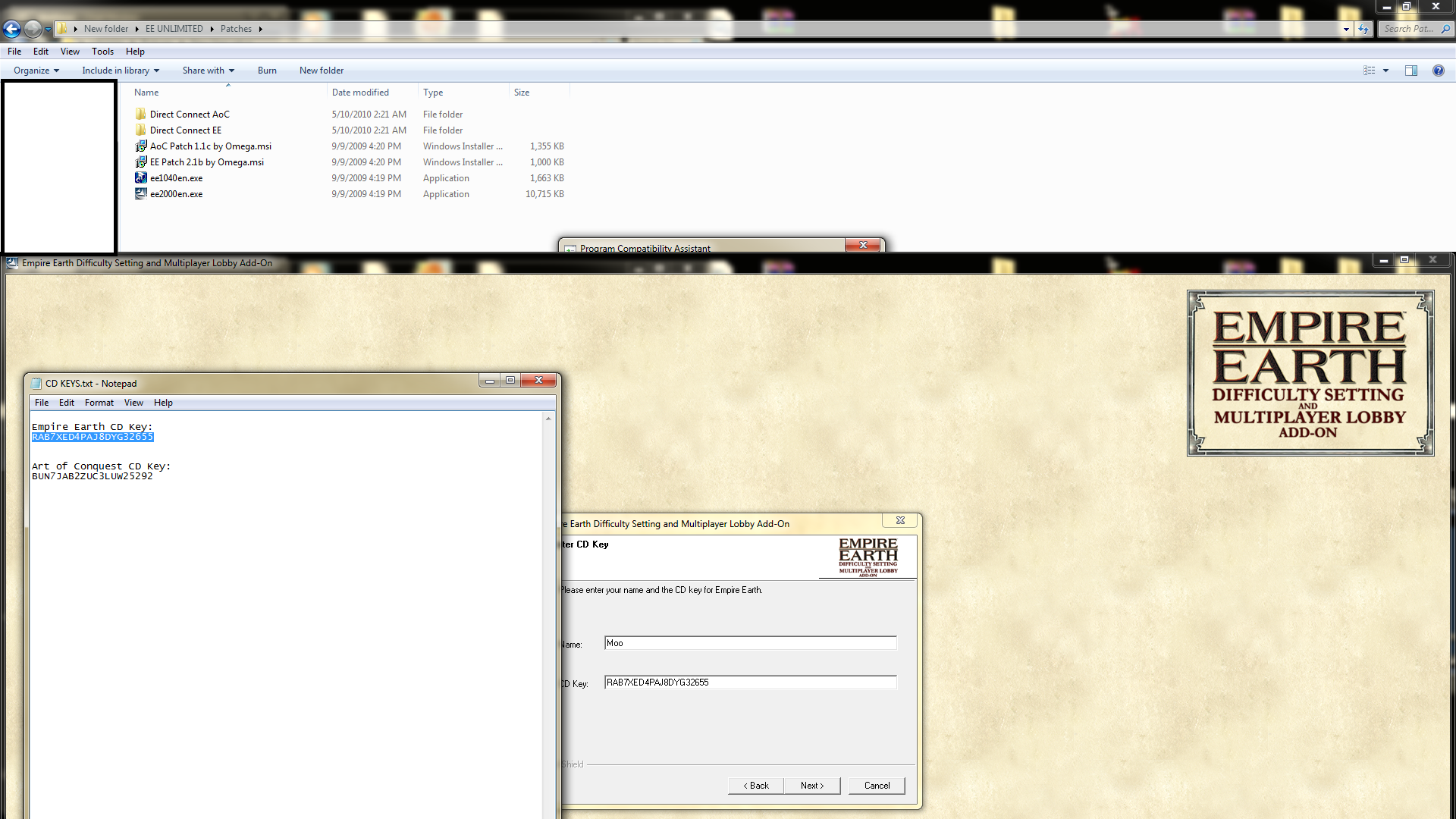 The 1040 to 2000 Pacth will ask you for your CD Key, again use the ones in the text document but this time use the key for the original EE