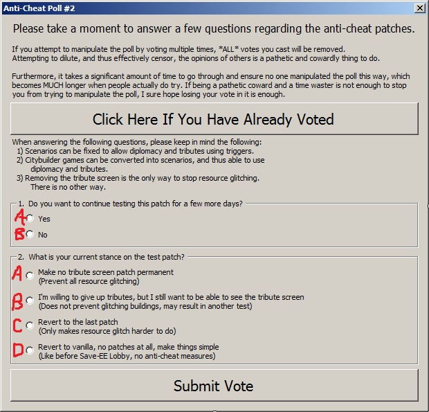Directions: Please read all questions carefully before answering them. For questions that ask you for your lobby or your forum username, PLEASE, give your *exact* lobby username or *exact* forum username! If you fail to do this, although we will do out best to ensure your vote gets counted, it's very possible it won't be. The only way to ensure your vote gets counted is to actually manage to copy/paste your CORRECT user name. It's not hard.