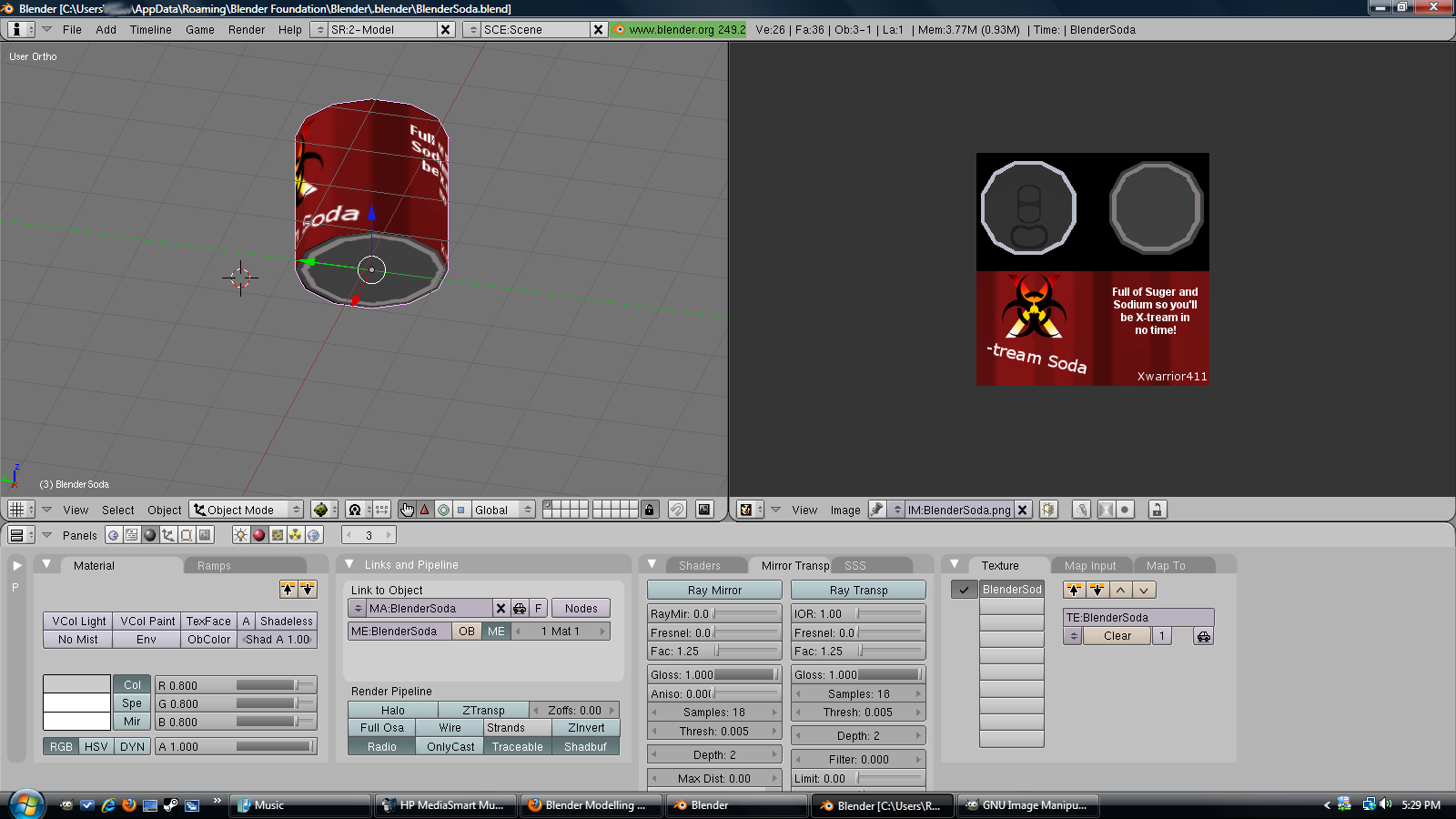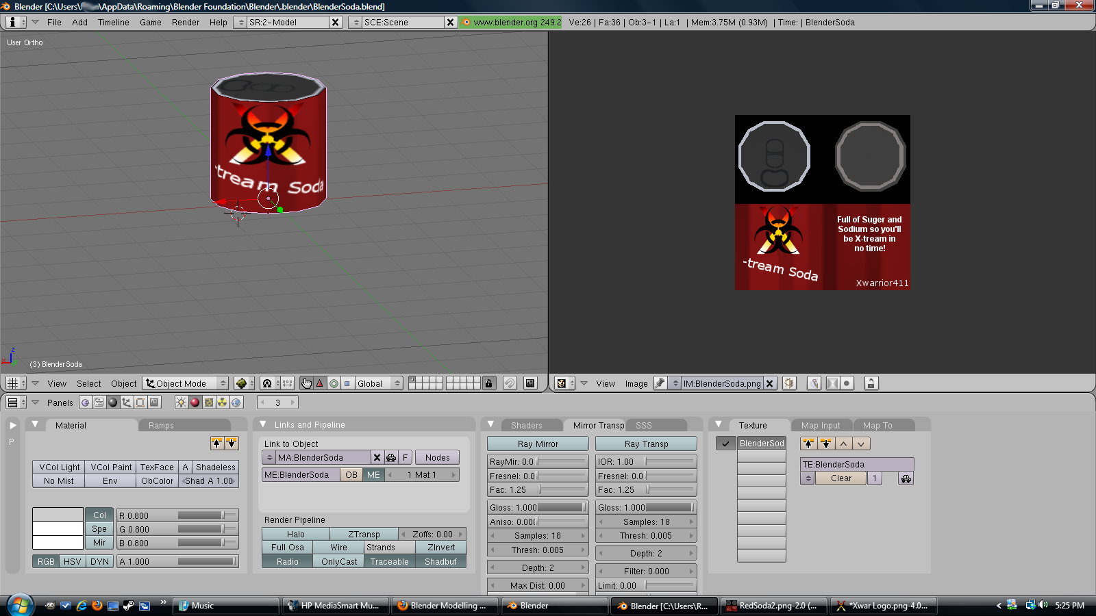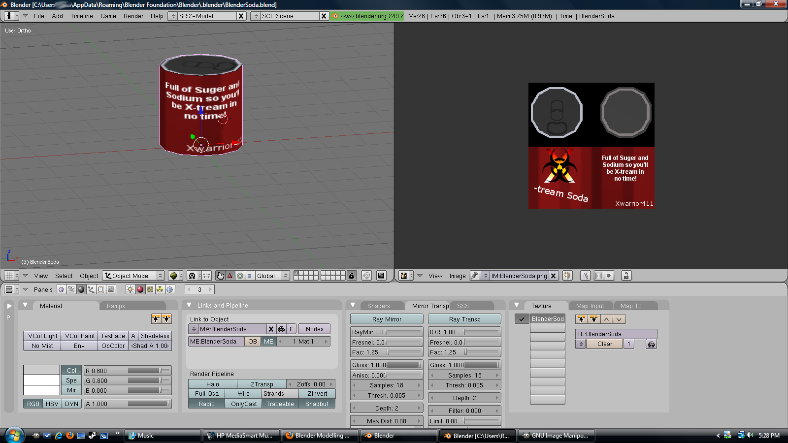 I'm trying to learn how to use a program called 'Blender', to create models (which is hard as hell, in-fact, 90% of what's on my screen I have no idea what it does). I started small, and made a soda can (which I underestimated the scale on how tall the cylinder would be, so there's a flaw). Why a soda can? A soda can is basically one cylinder with a texture applied to it, which is common for beginners to do, before they go on to create more complex things. (note: I intend to start making models for Garry's Mod, when I get better) Being an intermediate Graphics Designer has the benefit of allowing to create your own textures, like I did for the soda can.