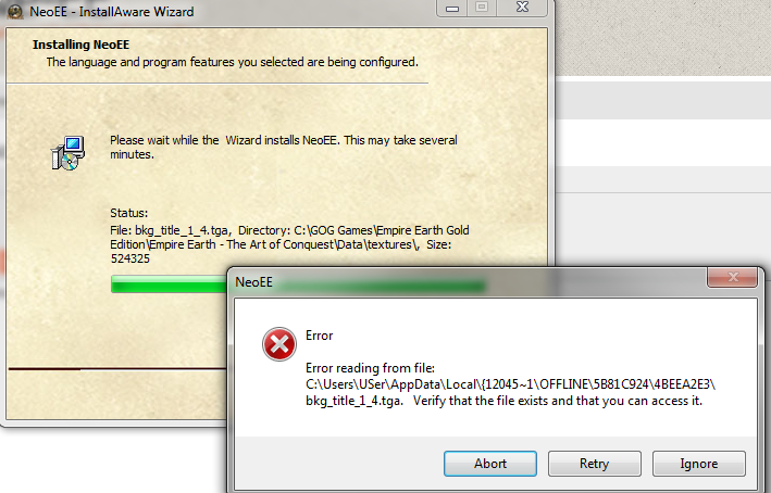hi guys when i am installing neoee he show me error reading file like this one(image) and when im ignore it next one is same but another file location....pls help me