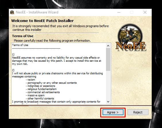 After installing EE (and AOC if you wish) you can start installing the NeoEE patch to play online with other players.